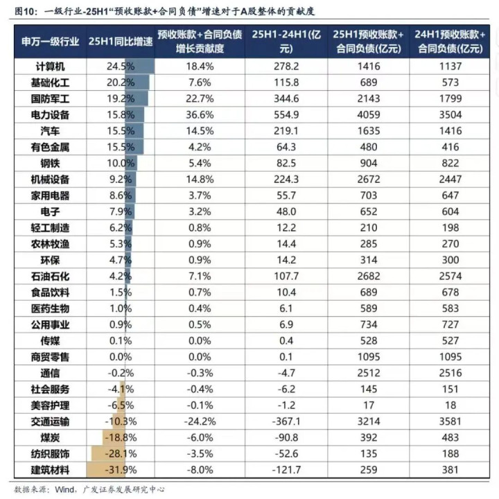 中报A股[预收账款+合同负债]同比增速继续大幅改善,其中H1同比增速较高、增长贡献度较高的一级行业是:计算机、基础化工、国防军工、电力设备、汽车。