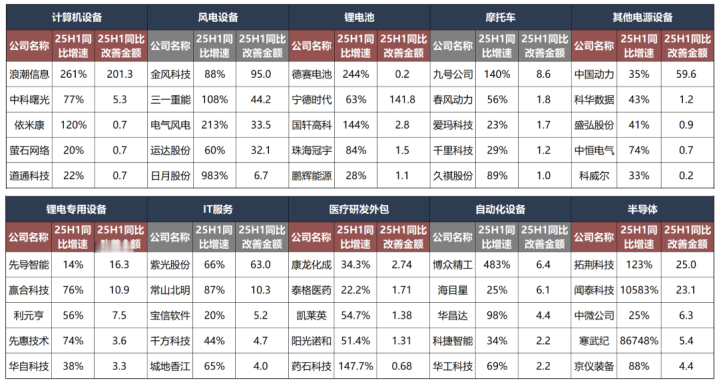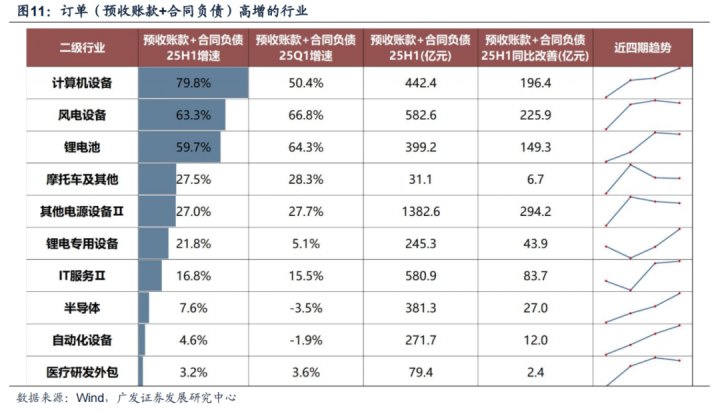 广发证券发布研报称,随着A股中报披露完毕,本次中报总量维度上出现值得关注的积极变化。A股订单指标延续改善,其中H1同比增速较高、增长贡献度较高的一级行业是:计算机、基础化工、国防军工、电力设备、汽车。除了市场认知较充分的订单高增的AI算力外,该行也进一步考察了其他行业,筛选25H1订单增速同比高增的行业:风电(电缆/风机/塔筒桩基)、锂电池、锂电设备、摩托车、半导体(设备)、CXO、自动化设备(如3C设备)、其他电源设备、IT服务、计算机设备。