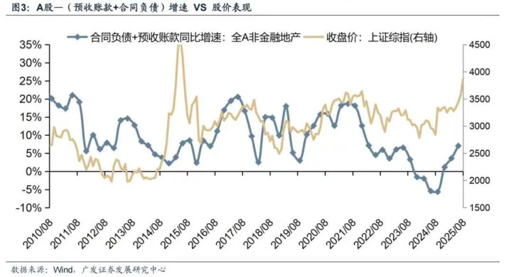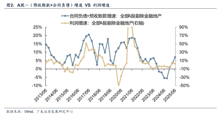 在A股及典型制造行业中,历史上[预收账款+合同负债]同比增速与“利润增速”存在正相关性。更进一步,对A股总体、及制造业的股价表现也有指示意义。